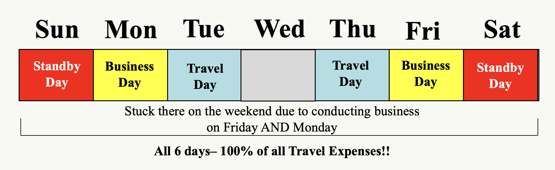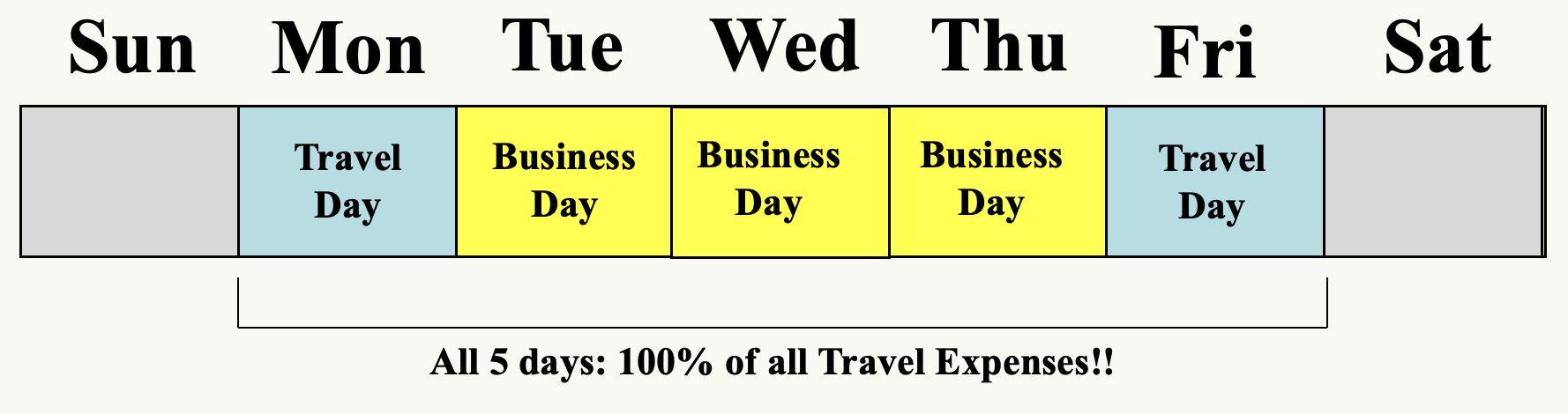 A 5-day business trip may look like this and all of the travel expenses for the full 5 days being full deductible.