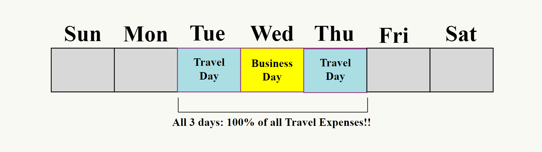 Thus, a properly planned 3-day trip may look something like this: Traveling on Tuesday for an important in-person meeting on Wednesday, and traveling back on Thursday. In this instance, all 3 days of travel expenses are 100% deductible.