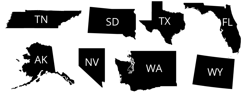 Tennessee, South Dakota, Texas, Florida, Alaska, Nevada, Washington, and Wyomning.